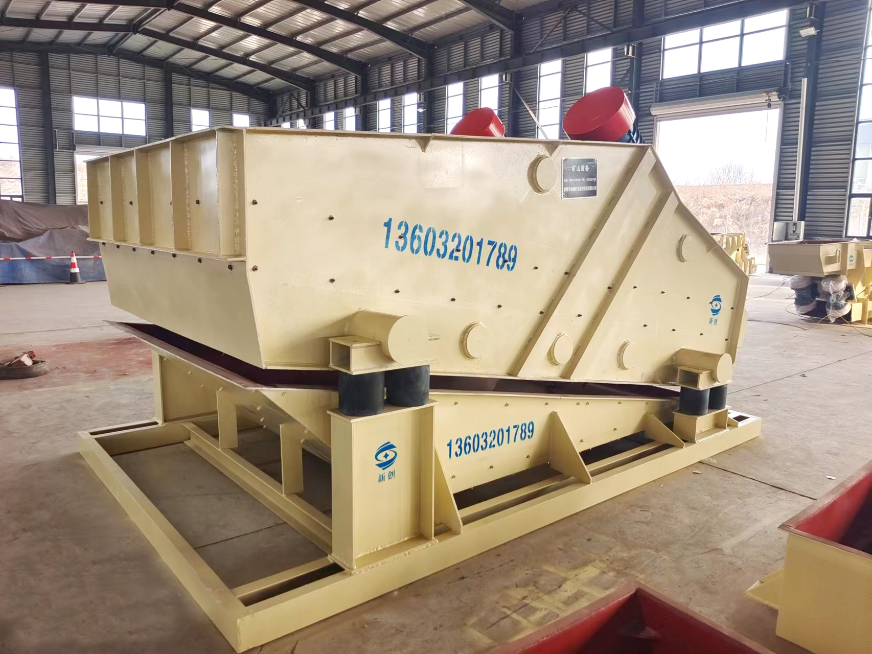 產(chǎn)品描述: 用于煤炭、水電、礦山、建材、化工、塑料、磨料、醫(yī)藥、糧食、炭素、化肥等行的設(shè)備 直線篩(直線振動篩)利用振動電機(jī)激振作為振動源,使物料在篩網(wǎng)上被拋起,同時向前作直線運(yùn)動,物料從給料機(jī)均勻地進(jìn)入篩分機(jī)的進(jìn)料口,通過多層篩網(wǎng)產(chǎn)生數(shù)種規(guī)格的篩上物、篩下物、分別從各自的出口排出。具有耗能低、產(chǎn)量高、結(jié)構(gòu)簡單、易維修、全封閉結(jié)構(gòu),無粉塵溢散,自動排料,更適合于流水線作業(yè)?! 」ぷ髟怼 SG系列振動篩工作時,兩電機(jī)同步反向旋轉(zhuǎn)使激振器產(chǎn)生反向激振力,迫使篩體帶動篩網(wǎng)做縱向運(yùn)動,使其上的物料受激振力而周期性向前拋出一個射程,從而完成物料篩分作業(yè). 直線振動篩是雙振動電機(jī)驅(qū)動。當(dāng)兩臺振動電機(jī)做同步、反缶旋轉(zhuǎn)時,其偏心塊所產(chǎn)生的激振力在平行于電機(jī)軸線的方向相互抵消,在垂直于電機(jī)軸的方向疊為一合力,因此篩機(jī)的運(yùn)動軌跡為一直線。兩電機(jī)軸相對篩面有一傾角,在激振力和物料自重力的合力作用下,物料在篩面上被拋起跳躍式向前作直線運(yùn)動,從而達(dá)到對物料進(jìn)行篩選和分級的目的。適用于粒度在0.074-5mm、含水量小于70%、無粘性的各種干式粉狀物料的篩分。給料粒度不大于10mm?! ZSF直線振動篩主要特點(diǎn)及適于行業(yè): 篩分精度高、處理量大、結(jié)構(gòu)簡單、耗能少、噪音低、篩網(wǎng)使用壽命長、密封性好、極少粉塵溢散、維修方便、可用于流水線生產(chǎn)中的自動化作業(yè)。 廣泛應(yīng)用于化工、食品、塑料、醫(yī)藥、冶金、玻璃、建材、糧食、化肥、磨料、陶瓷等行業(yè)中干式粉狀或顆粒狀物料的篩分?! 』咎攸c(diǎn) 穩(wěn)定可靠、消耗少、噪音低、壽命長、振型穩(wěn)、篩分效率高等?! ZSF直線振動篩主要特點(diǎn): 1、密封性好、極少粉塵溢散?! ?、耗能少、噪音低、篩網(wǎng)使用壽命長?! ?、篩分精度高、處理量大、結(jié)構(gòu)簡單?! ?、全封閉結(jié)構(gòu)、自動排料、更適合于流水線作業(yè)?! ?、篩體各部分均采用扎制鋼板及型材焊接而成(部分組體間為螺栓連接)整體剛度好,牢固可靠。